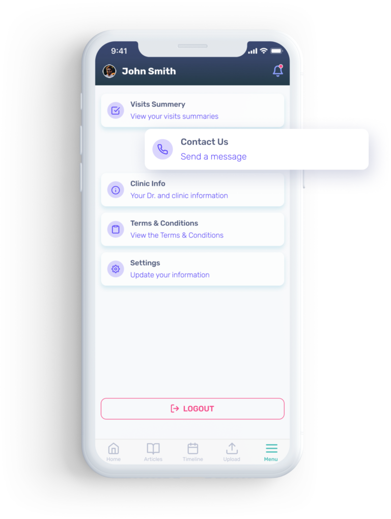 מסך התפריט מכיל את כל הכלים והשירותים הנדרשים למשתמש, כגון הגדרות, אפשרויות יצירת קשר, מידע על הקליניקה ועוד. העיצוב של התפריט נועד להיות אינטואיטיבי ונוח לשימוש, כך שהמשתמשים יוכלו לגשת במהירות לכל הפונקציות והמידע שהם צריכים. התפריט מאפשר התאמה אישית של חוויית המשתמש, ומספק גישה קלה לכל המשאבים והכלים התומכים בטיפול ובניהול המידע הרפואי.